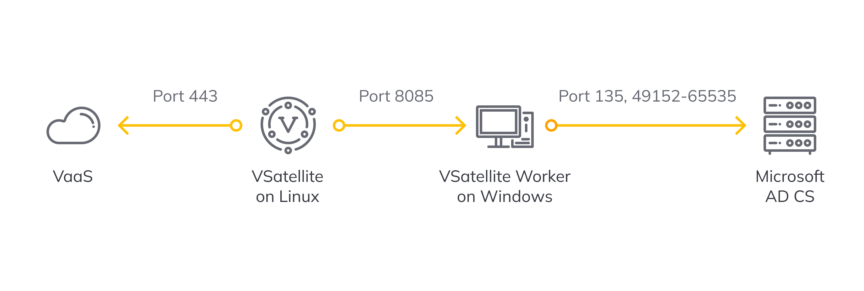 Microsoft AD CS connects to Certificate Manager - SaaS using a VSatellite and a VSatellite Worker.